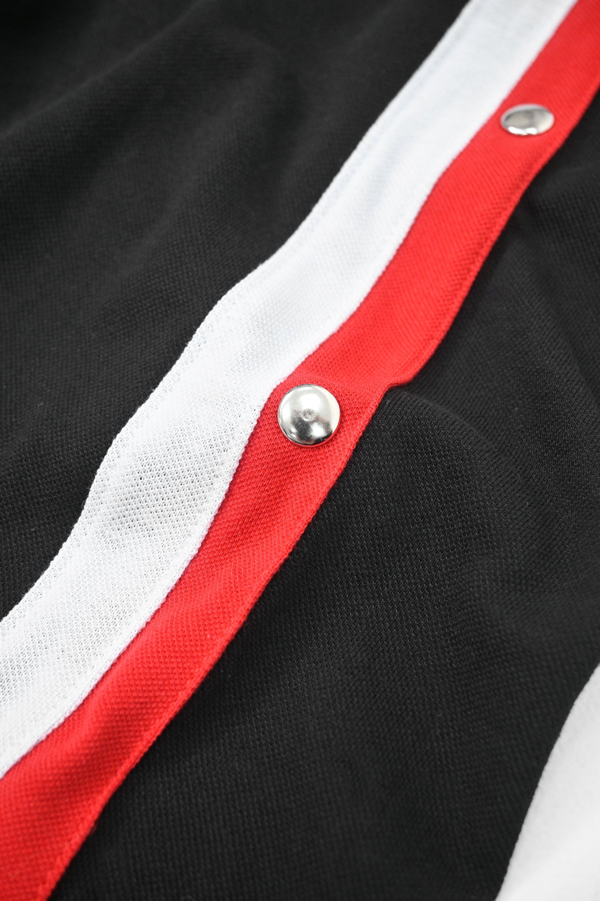 Strategically placed snap closures running along the contrasting red and white side stripes, offering versatility and easy adjustability for added ventilation or styling.
